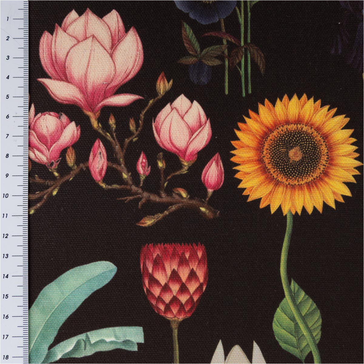 Dieser hochwertige Baumwollstoff in Halbpanama-Qualität verbindet kräftige Farben, exotische Motive und robuste Stoffstruktur. Die detailreichen Blumen, Palmenblätter und tropischen Elemente kommen auf dem tiefschwarzen Hintergrund besonders intensiv zur Geltung. Neben Sonnenblumen und Magnolien findest du auch seltene exotische Blüten – ein echter Hingucker für moderne Wohnideen.