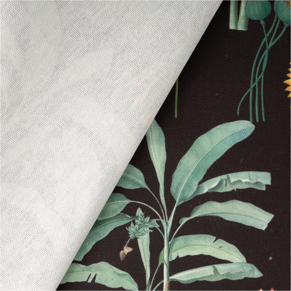 • Brillanter Digitaldruck mit farbintensiven Blumen und Palmenblättern auf schwarzem Hintergrund
