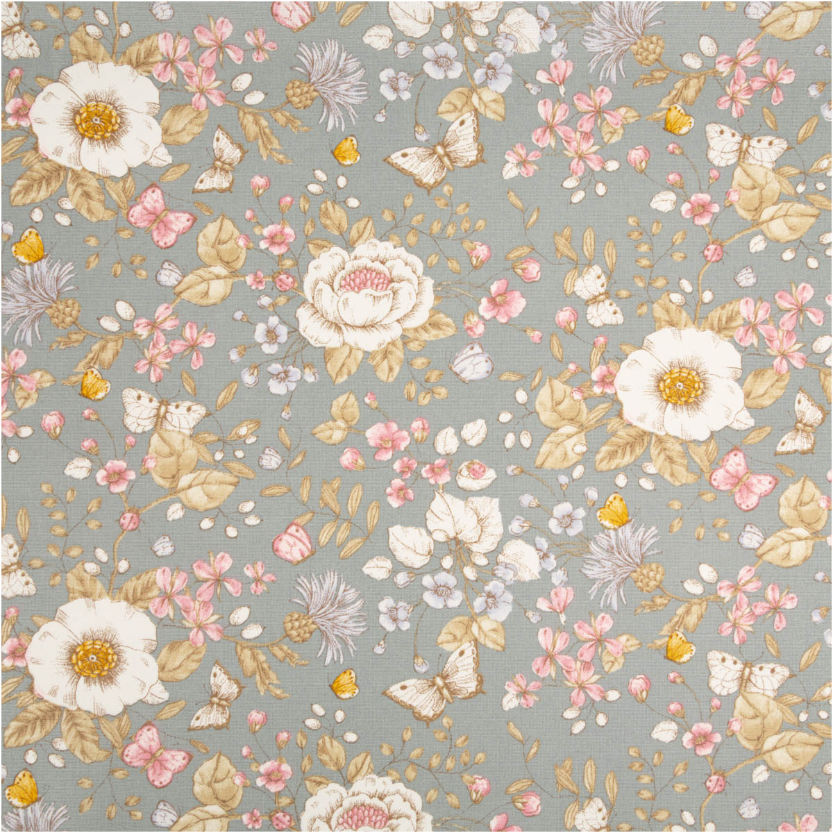 Dekostoff Butterfly Flower Garden – Blumen & Schmetterlinge in Mintgrün, Rosa und Weiß