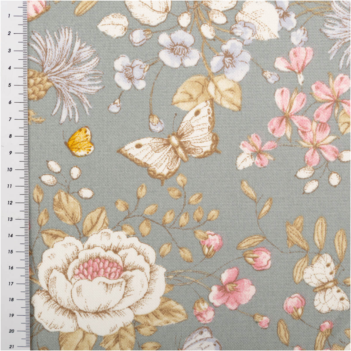 Hochwertiger Halbpanama-Dekostoff mit Blumen- und Schmetterlingsmotiv