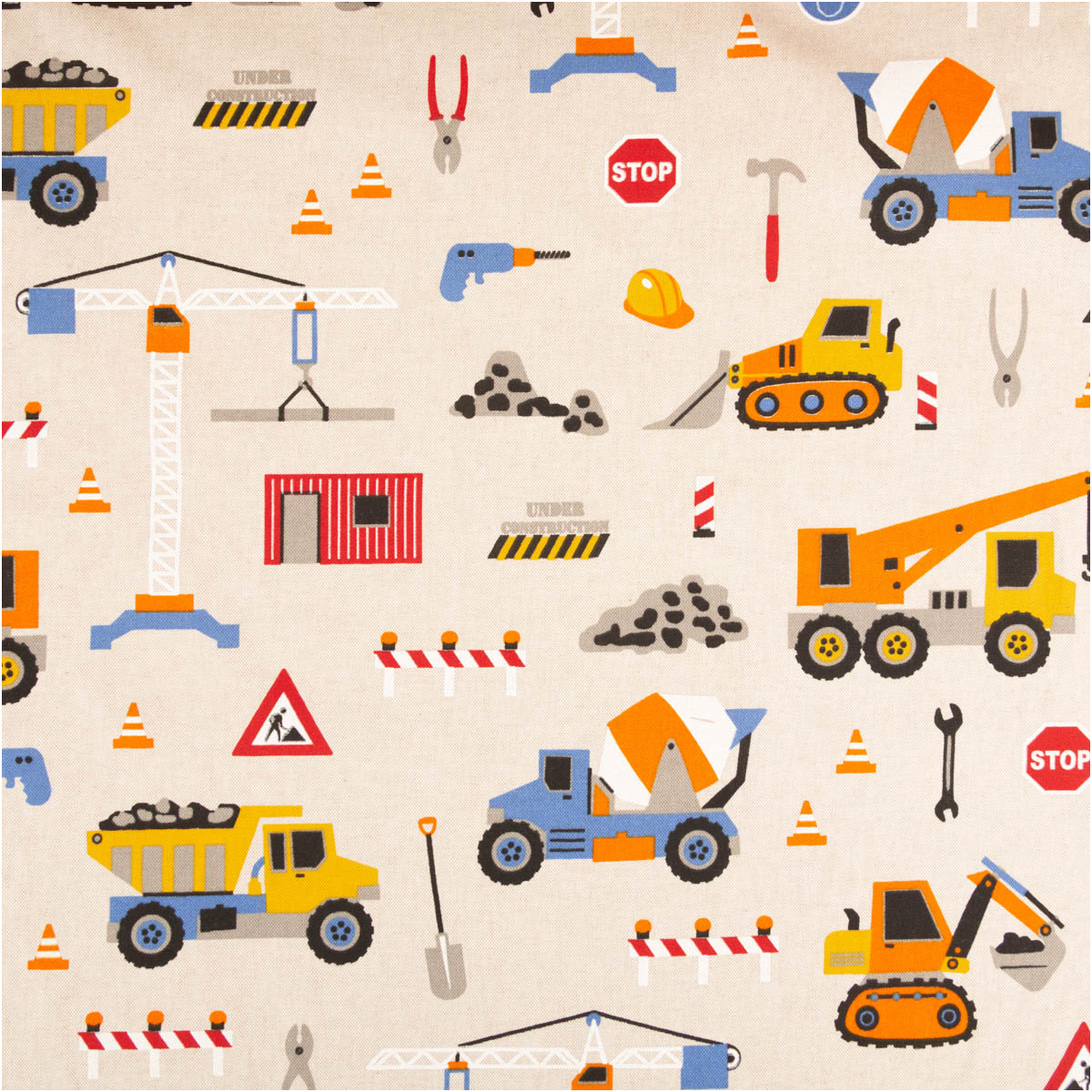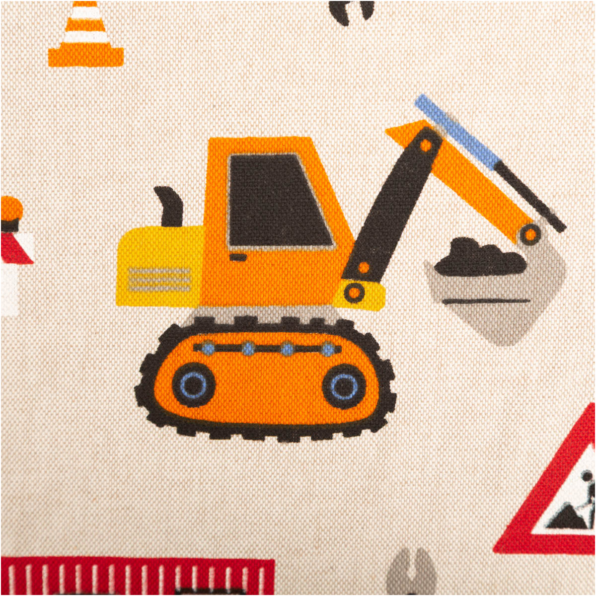 Dekostoff im Leinenlook mit bunten Baustellenmotiven für kreative Kinderzimmer