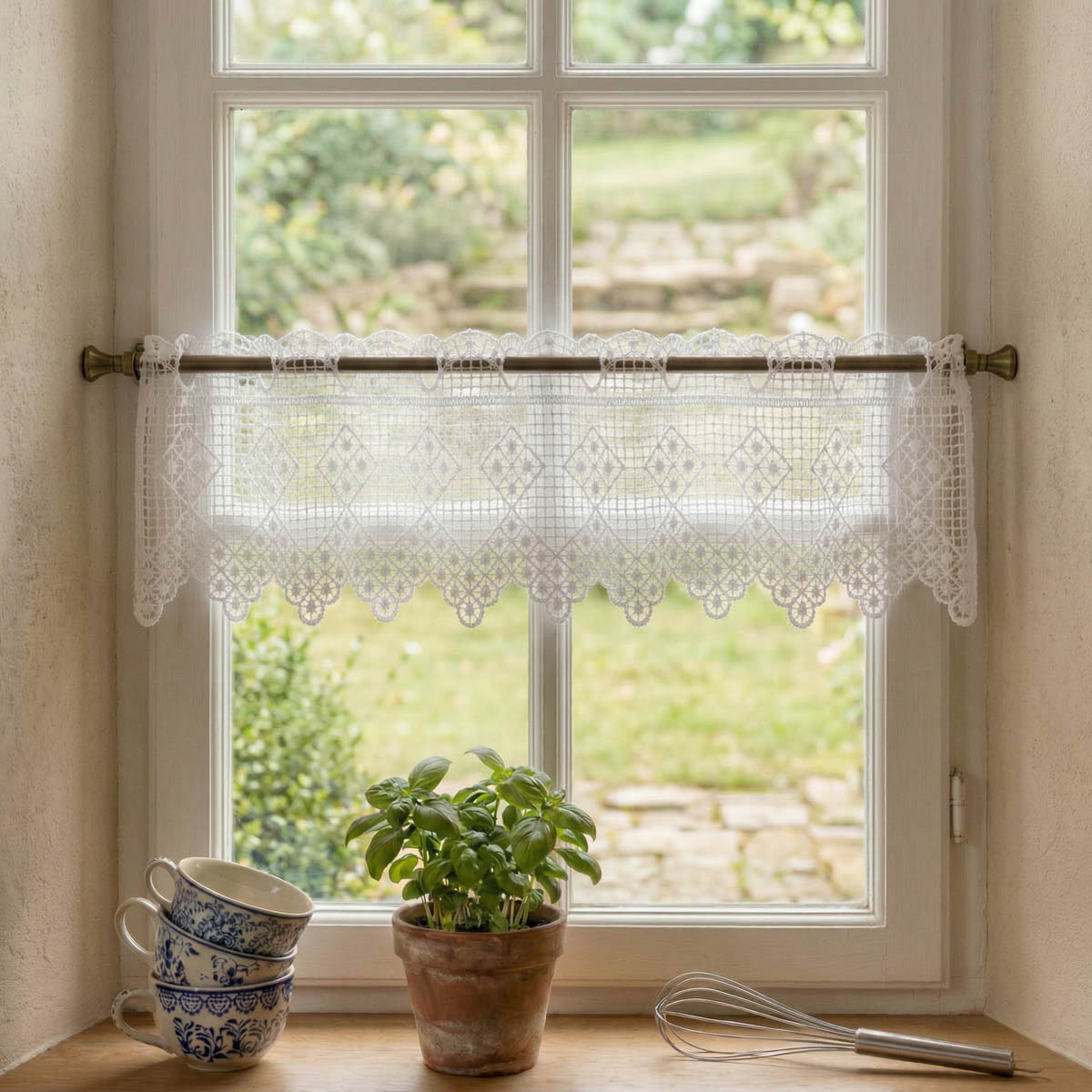 Das Design verbindet eine luftige Spitzenstruktur mit einem klaren, geometrischen Pik-Karo-Muster. Dadurch wirkt die Scheibengardine zugleich traditionell und ordentlich. Die weiße Farbgebung passt zu vielen Wohnstilen und lässt sich besonders gut mit hellen, natürlichen oder romantischen Einrichtungen kombinieren.
