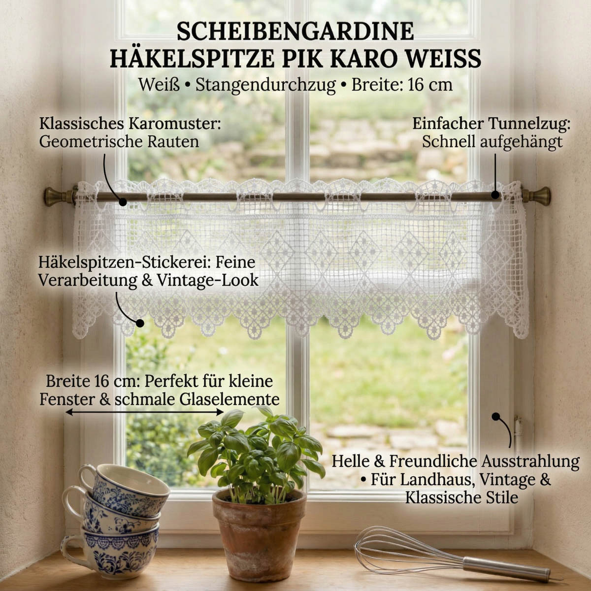 Diese Scheibengardine aus weißer Häkelspitze bringt eine leichte, dekorative Optik an dein Fenster. Das feine Pik-Karo-Muster mit filigraner Stickerei wirkt klassisch, freundlich und vielseitig kombinierbar. Mit ihrer schmalen Breite von 16 cm eignet sich die Gardine besonders gut für kleine Fensterscheiben, Glastüren, Vitrinen oder dekorative Einsätze im Landhausstil.