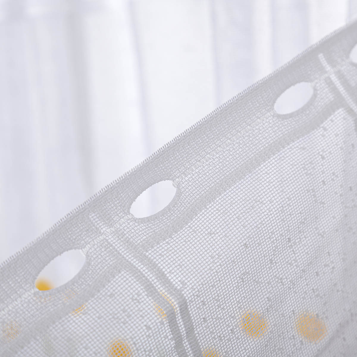 Diese wunderschöne nähfreie Scheibengardinen Meterware vereint modernes Design mit unkomplizierter Handhabung. Das stilvolle Jacquard-Muster mit Margeriten in Weiß, Gelb und Grün bringt frische Akzente in dein Zuhause und sorgt für eine charmante Fensterdekoration.