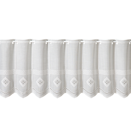 - Aufhängung: eingestickte Löcher für Vitragenstange