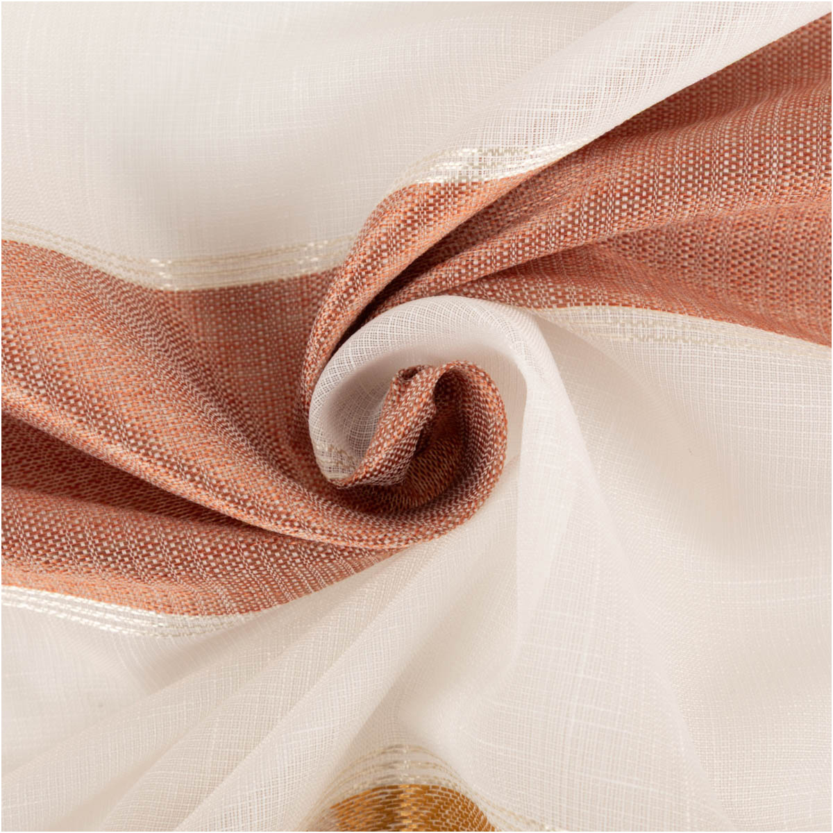 HOCHWERTIGER VOILE MIT JACQUARD – Halbtransparenter Gardinenstoff mit eingewebten Querstreifen und elegantem Dessin in Kupfer, Gold und Grau für eine moderne Fensterdekoration