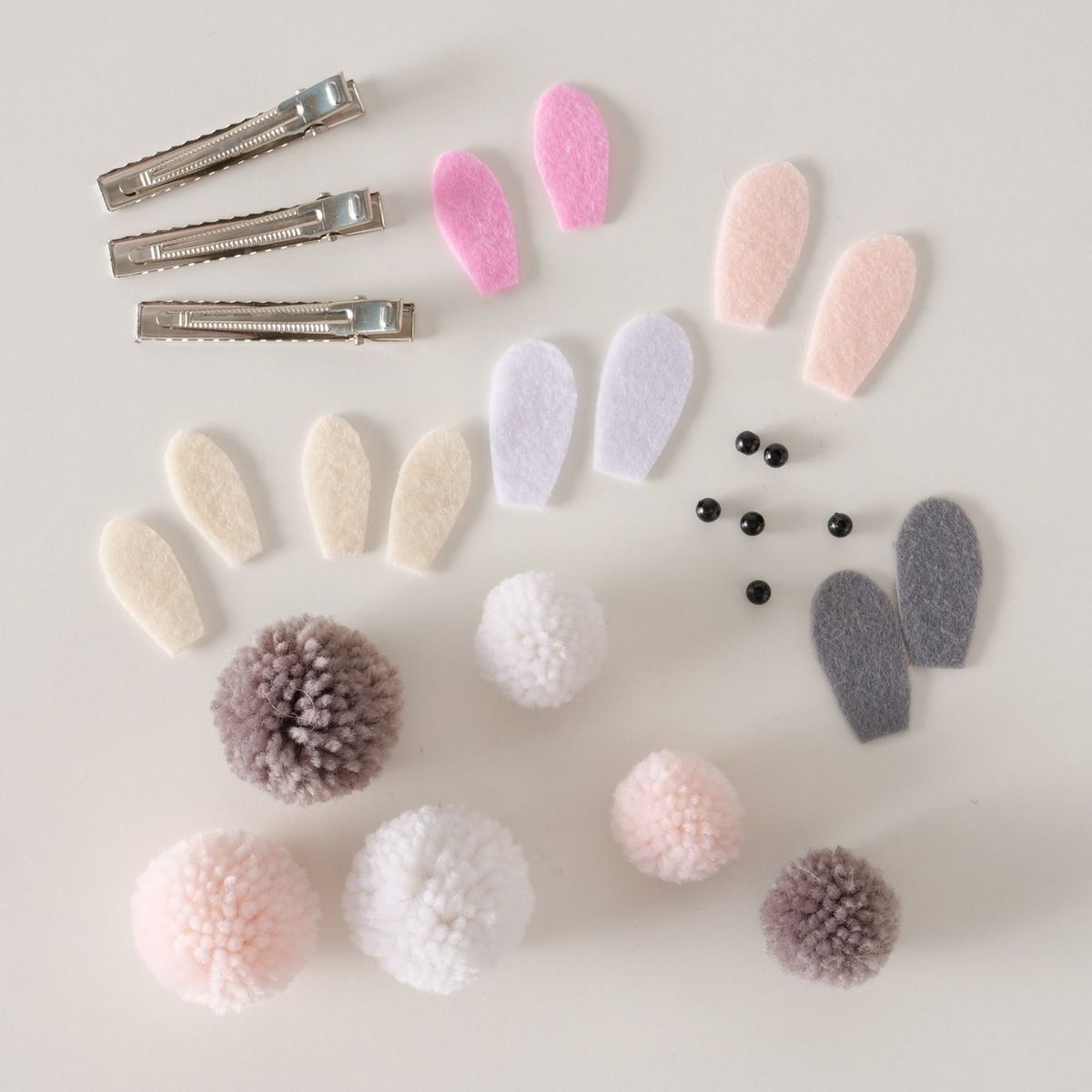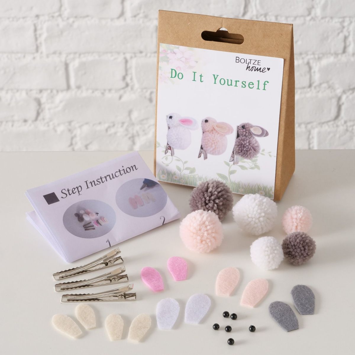 Mit Pompons, Filzteilen, Metallklammern und Anleitung für ein liebevoll abgestimmtes Bastelprojekt mit Hasenmotiv
