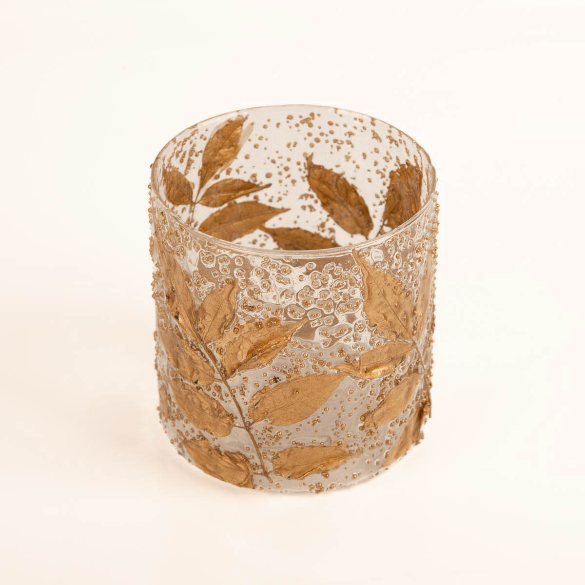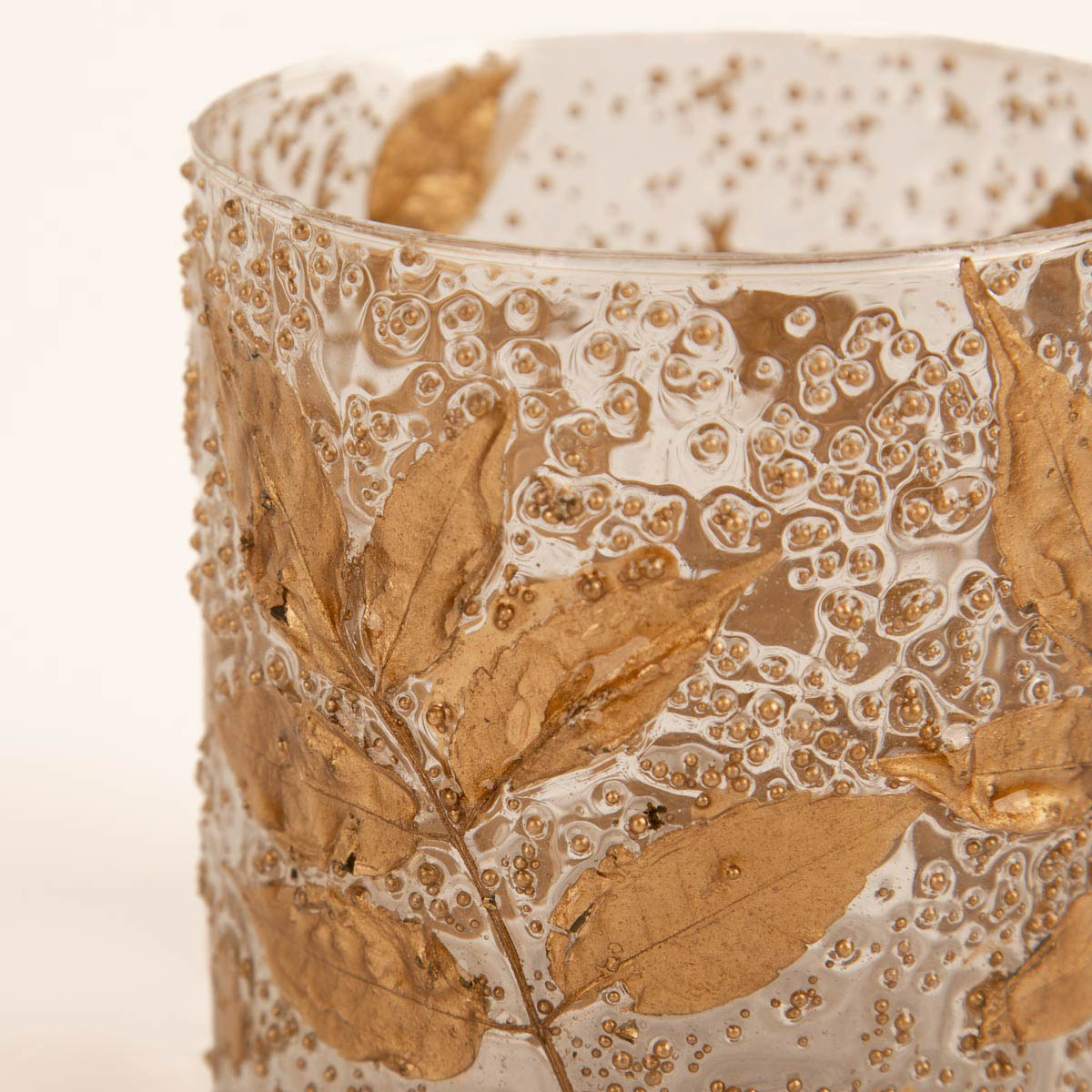 Mit dem Windlicht Leaves bringst du schimmernde Lichtakzente in dein Zuhause. Das transparente Glas ist rundum mit goldfarbenen Blättern und feinen Strukturelementen versehen, die das Kerzenlicht auf besonders schöne Weise brechen. So entsteht ein warmes, gemütliches Lichtspiel, das perfekt für Abende auf dem Sofa, festliche Tischdekorationen oder die Fensterbank geeignet ist.