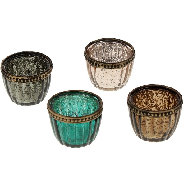 Dekorativer Teelichthalter aus gerilltem Glas mit edlem Metallrand
