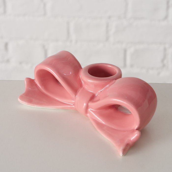 Kerzenhalter aus Keramik in rosa Schleifenform – glänzend glasiert.