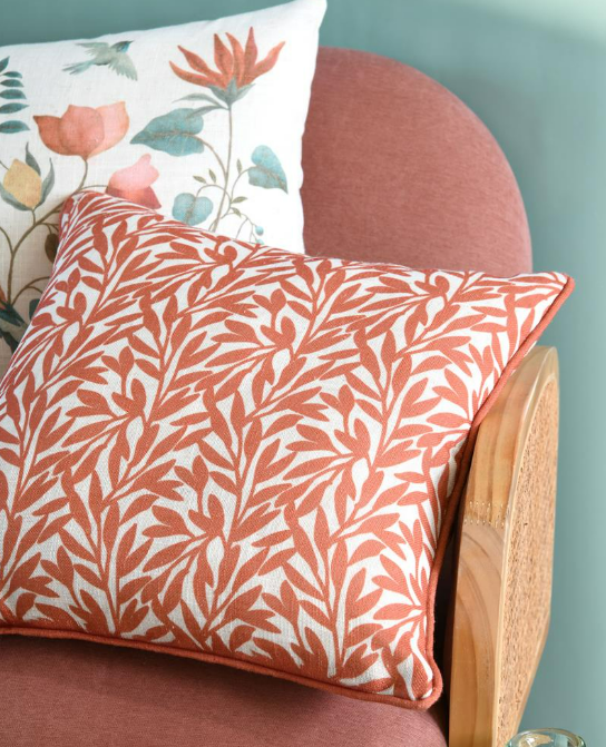 Der Stoff mit 10 % Leinenanteil verleiht dem Kissen eine sicht- und fühlbare Leinenstruktur. Dadurch wirkt das Kissen besonders natürlich und hochwertig. Das Blätterdessin ist auf beiden Seiten identisch gestaltet und sorgt für ein stimmiges Gesamtbild – ideal für Sofa, Sessel oder Bett.