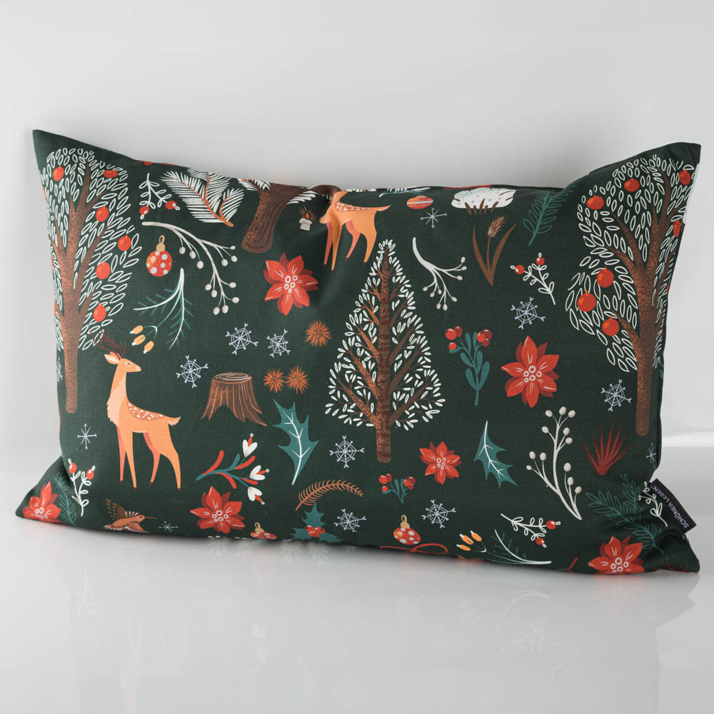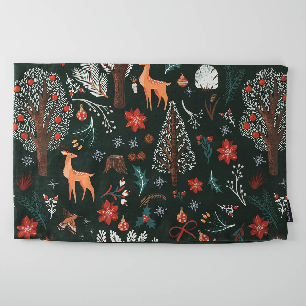 Die Kissenhülle Scandi Winter Forest aus unserer SCHÖNER LEBEN. Kollektion ist überall ein wunderschöner weihnachtlicher Hingucker. Die vielen Motive wie Rehe, Beeren, Bäume und Stechpalmen kommen auf dem dunkelgrünen Untergrund toll zur Geltung und machen dein winterlich-weihnachtliches Zuhause noch schöner und gemütlicher. Die Weihnachts-Kissenhülle aus reiner Baumwolle mit skandinavischem Winterwald-Digitaldruck hat einen natürlichen Charakter und ist aus robustem Halbpanama-Stoff genäht.