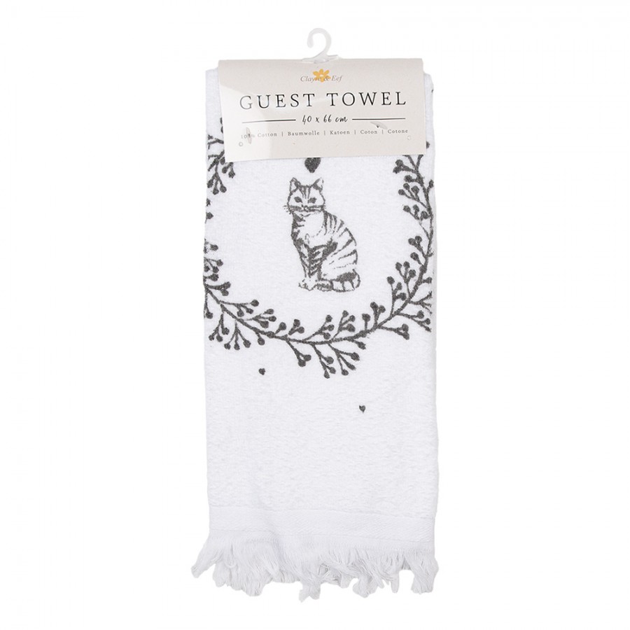 Gästehandtuch von Clayre & Eef in Weiß und Schwarz mit liebevollem Katzenmotiv, ideal für Badezimmer, Gäste-WC oder Küche