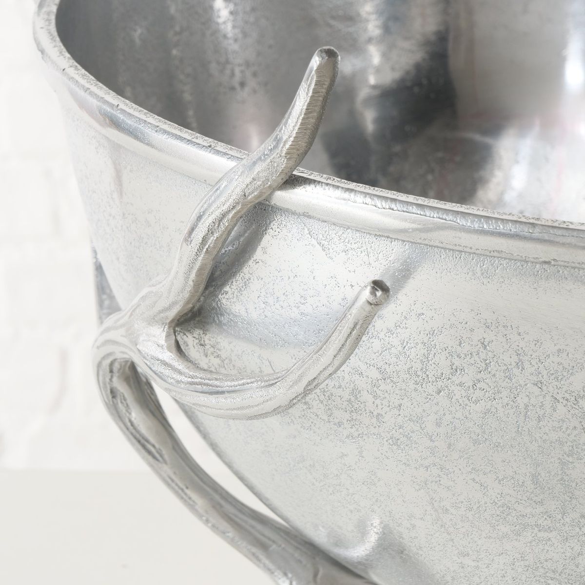 Der Flaschenkühler besteht aus Aluminium und ist vernickelt. Dadurch erhält er seine glänzende silberfarbene Oberfläche und eine hochwertige, stabile Wirkung. Das Material ist robust verarbeitet und unterstützt die langlebige Nutzung im Innenbereich. Gleichzeitig sorgt die Metalloptik für einen ausdrucksstarken Auftritt.