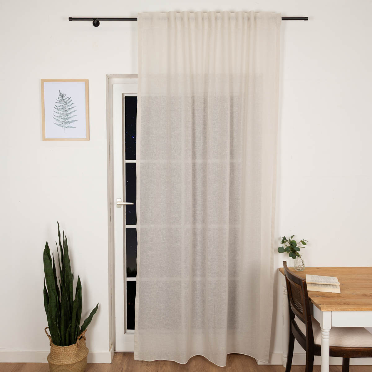 Die schlichte Leinenstruktur-Gardine in einem dezenten Uni Naturton sieht nicht nur schön aus sondern erfüllt auch nützliche Funktionen wie Schall dämmen, Wärme speichern und Sichtschutz spenden.