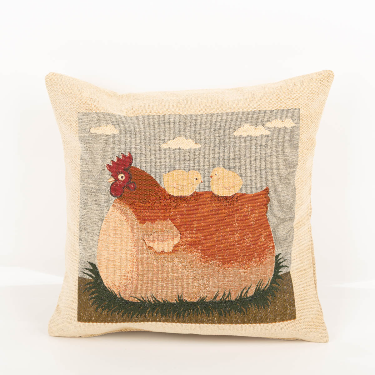 Eingewebtes Motiv: hochwertige Gobelin Kissenhülle „Henne mit Küken“ in Beige, strukturierte Optik statt Druck
