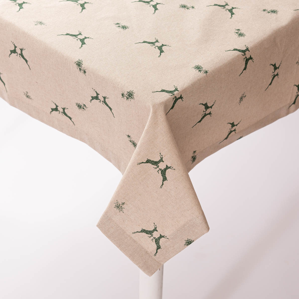 Tischdecke im Leinenlook mit dekorativem Hirsch- und Edelweißmotiv in Natur und Grün