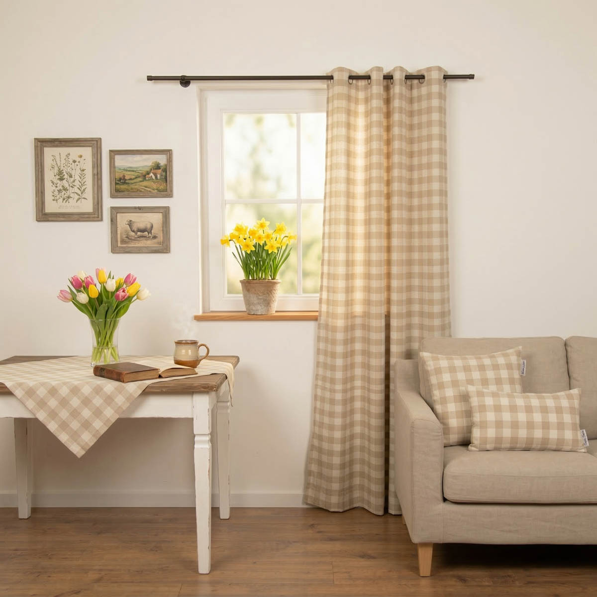 Dazu passt die Tischdecke mit Karos in Beige und Weiß