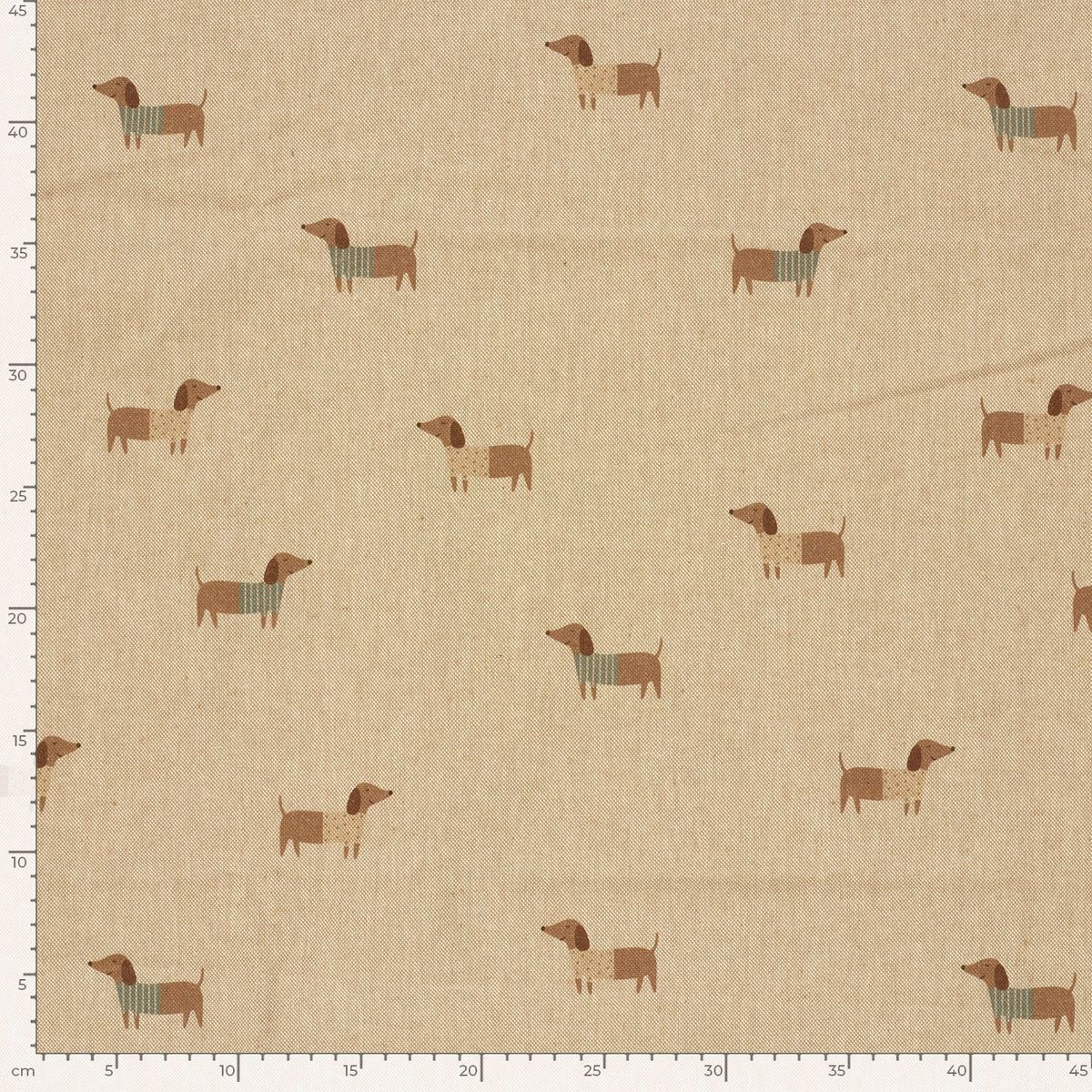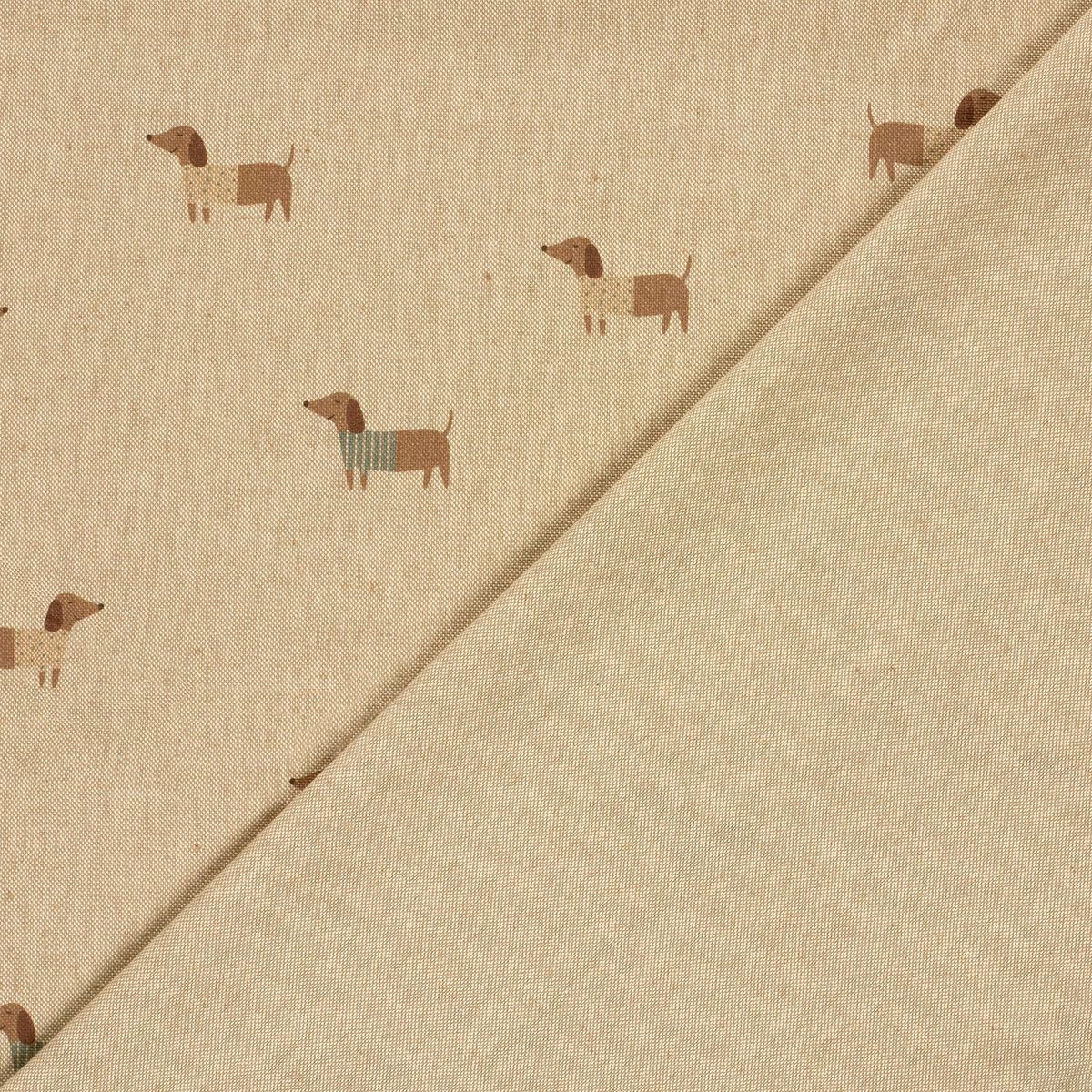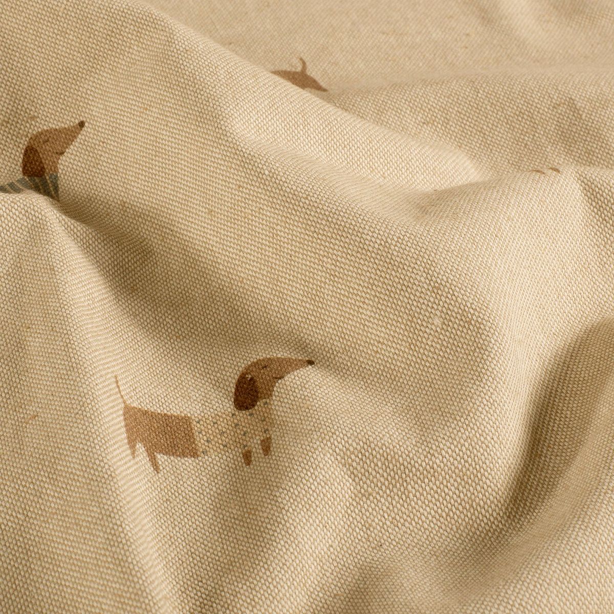 Blickdichter Dekostoff in Leinenoptik mit liebevollem Dackel-Print in warmen Naturtönen für eine gemütliche und natürliche Wohnatmosphäre