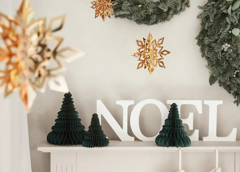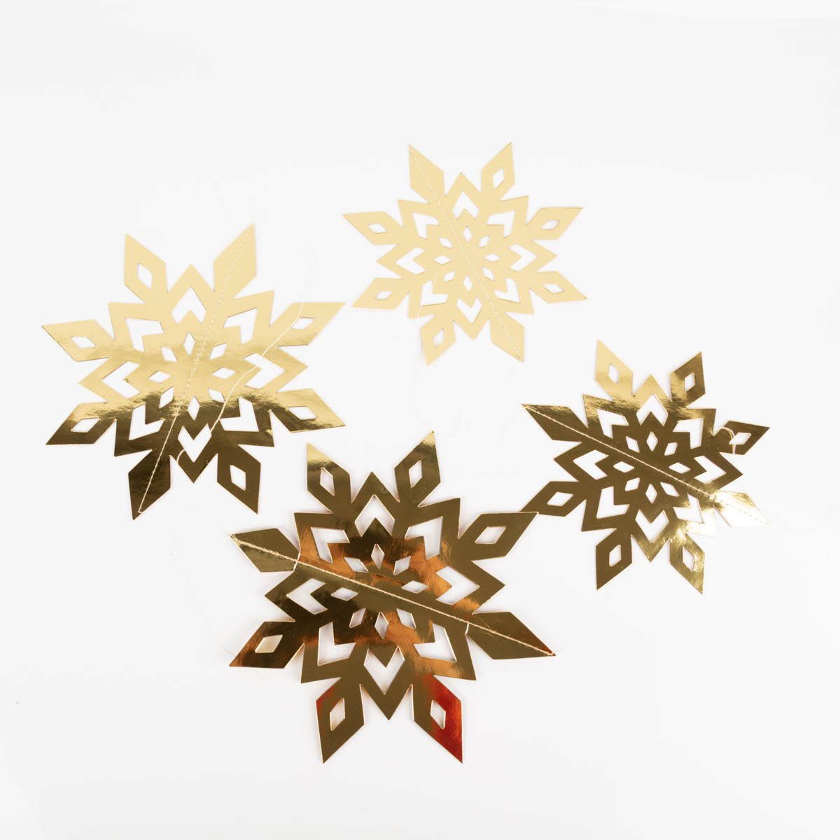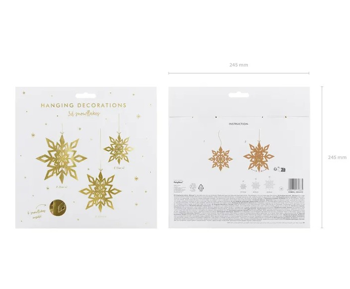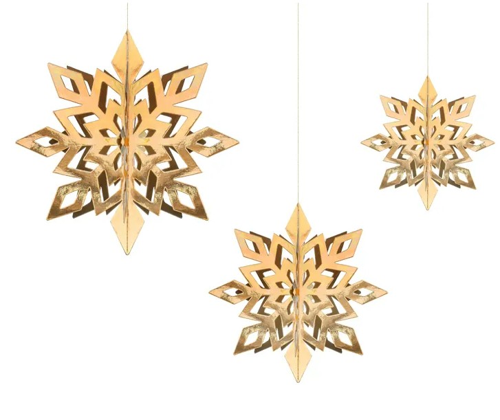 Mit diesem 3D Schneeflocken Anhänger Set in Gold bringst du festlichen Glanz in deine Weihnachtsdeko. Die Schneeflocken bestehen aus stabilem Papier, kommen flach verpackt und lassen sich im Handumdrehen auffalten. Danach erstrahlen sie in ihrer vollen 3D-Form mit sechs aufgefächerten Seiten.