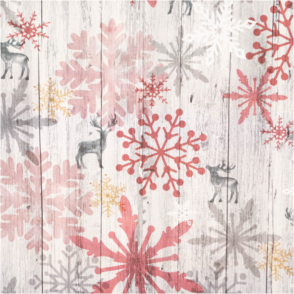 Muster: Hirsche & Schneeflocken auf Holzlattenoptik in Grau, Rot, Weiß, Gold