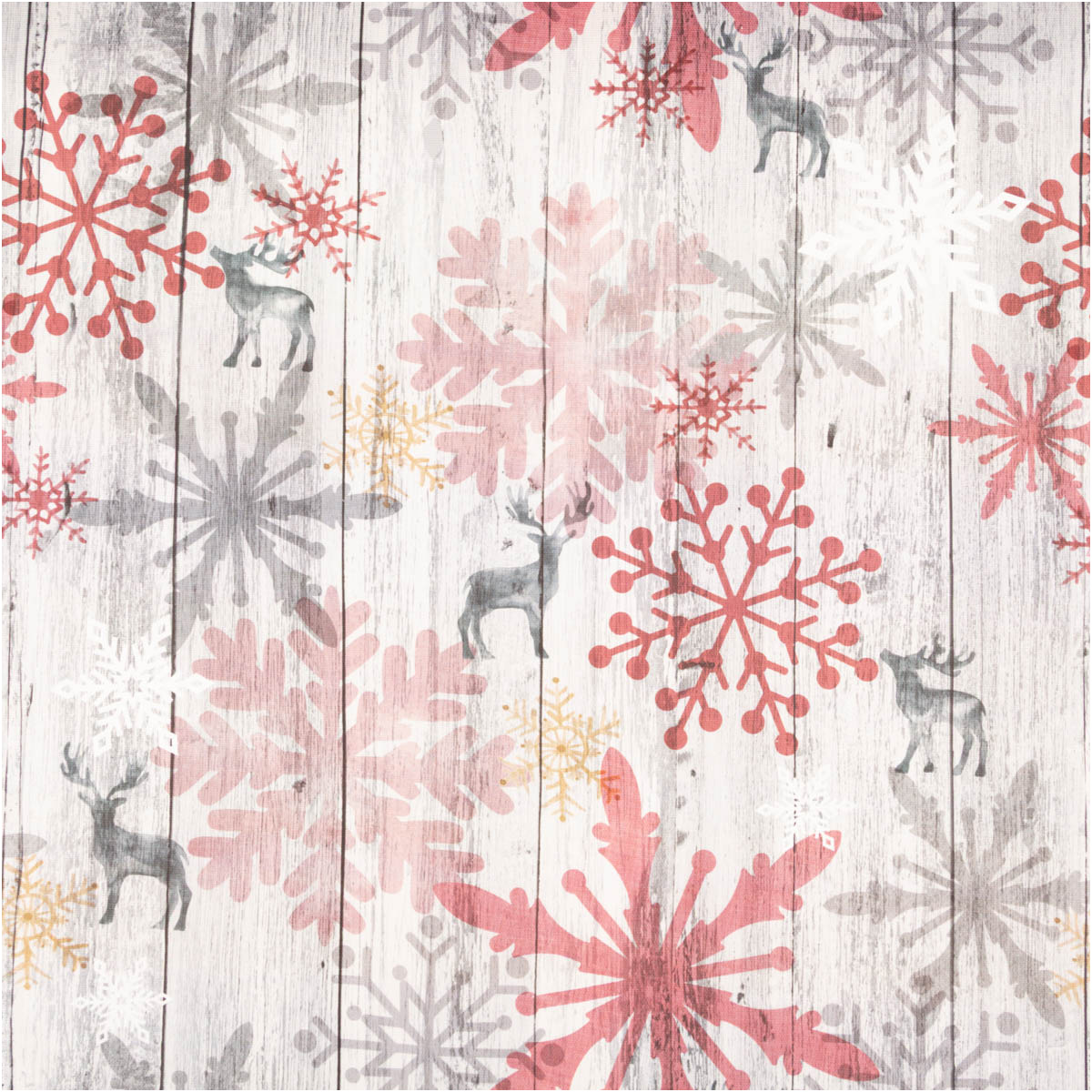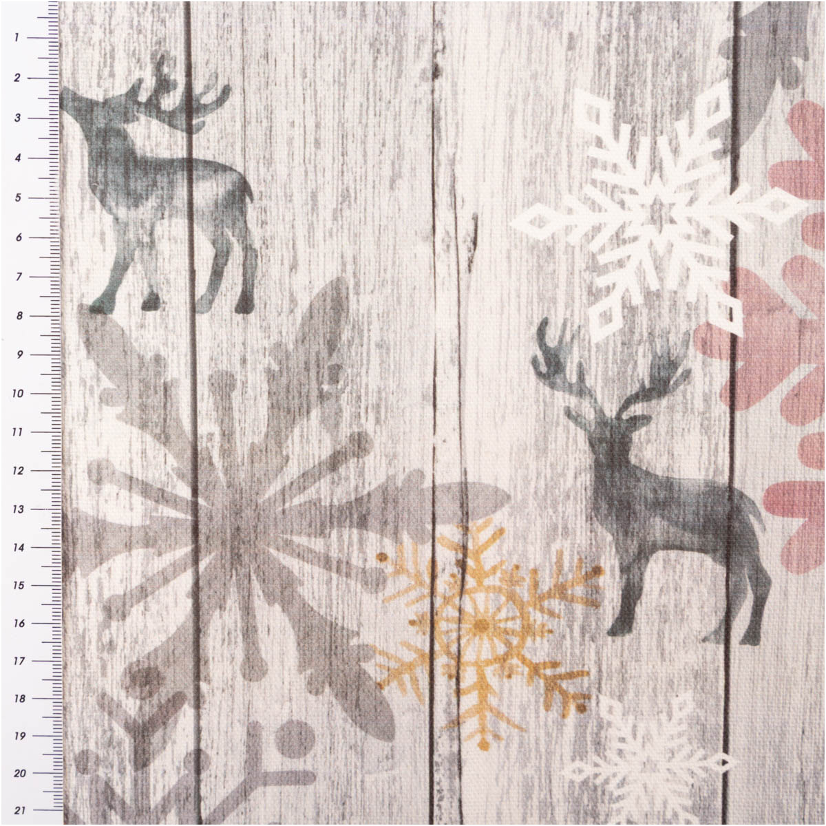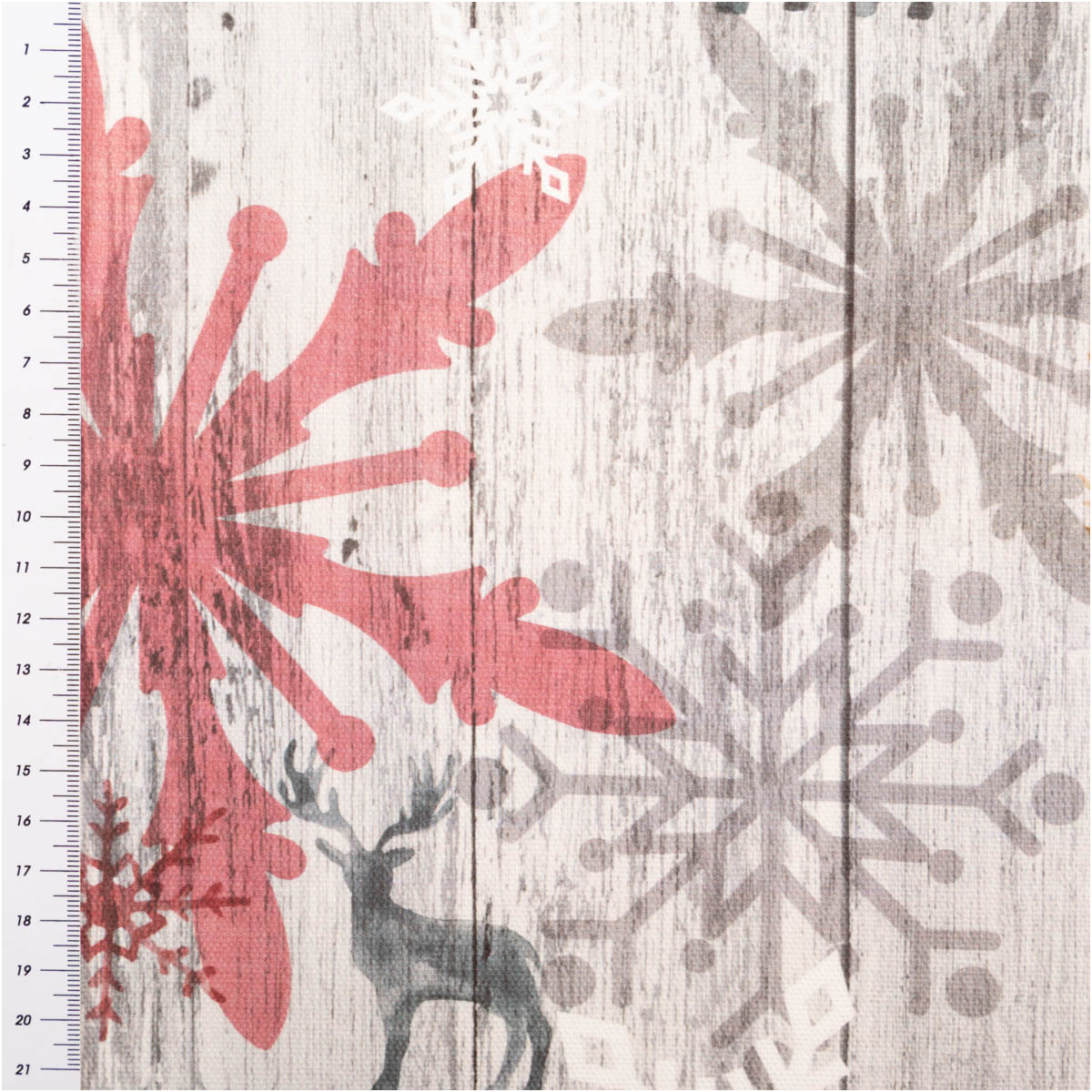 Hochwertiger Baumwollstoff Halbpanama mit Digitaldruck in Holzlattenoptik, Hirschen und Schneekristallen in Grau-Rot