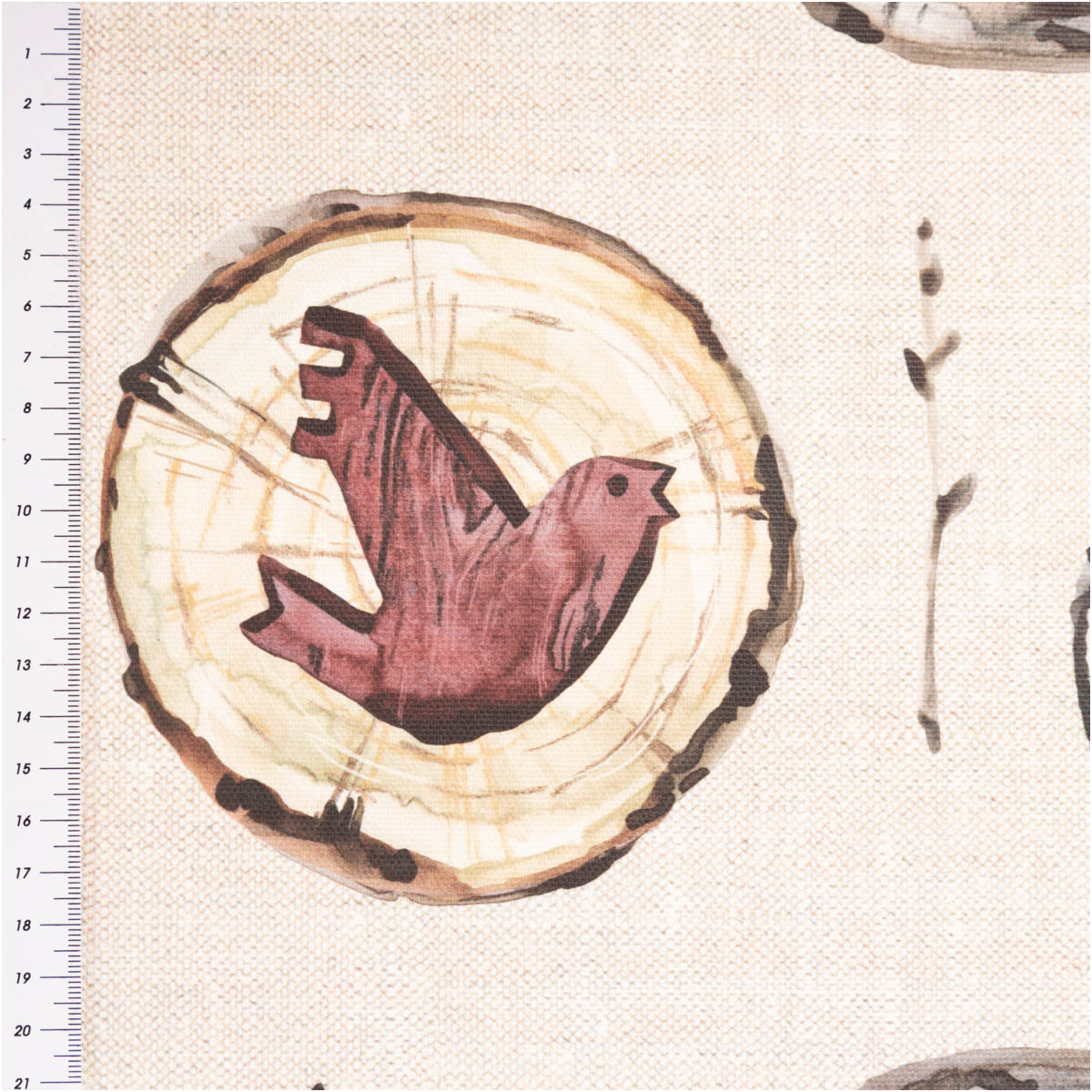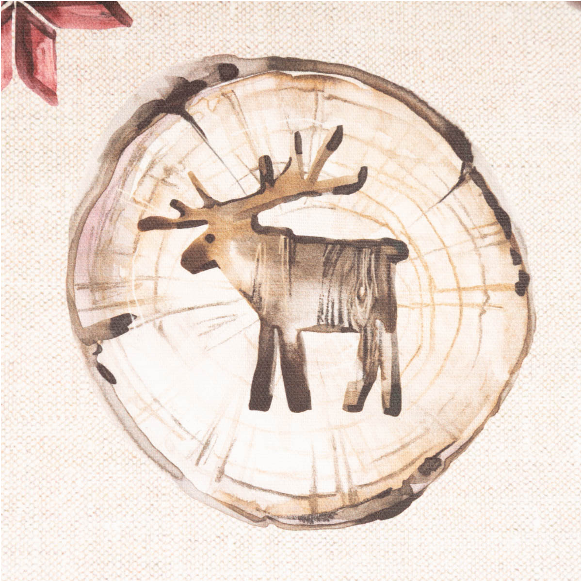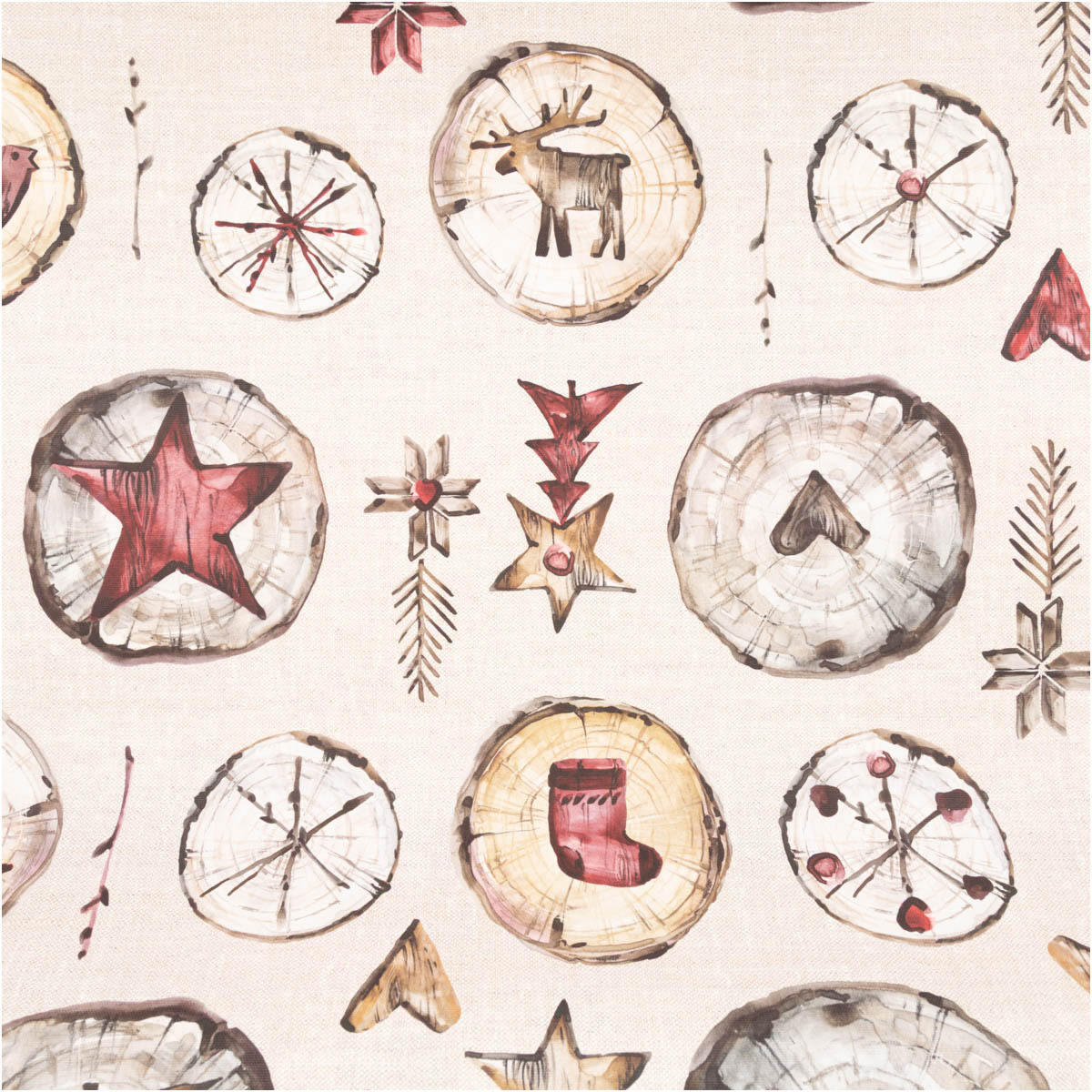 Hochwertiger Baumwollstoff Halbpanama mit Holzscheiben-Motiv, Elchen, Sternen & Herzen in warmen Naturtönen