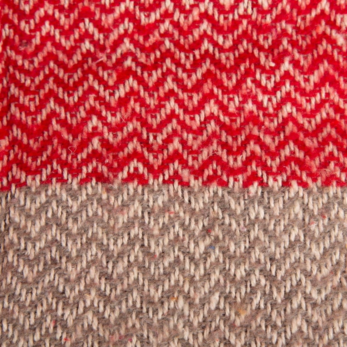 Das dezente Fischgrät-Dessin bringt Struktur und Tiefe in das Design, ohne aufdringlich zu wirken. Der naturfarbene Grundton wird durch den roten Kontraststreifen stilvoll ergänzt. Die Fransen an den kurzen Seiten runden das Gesamtbild harmonisch ab.