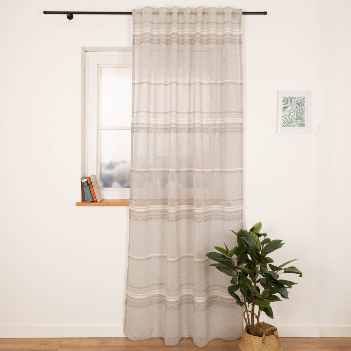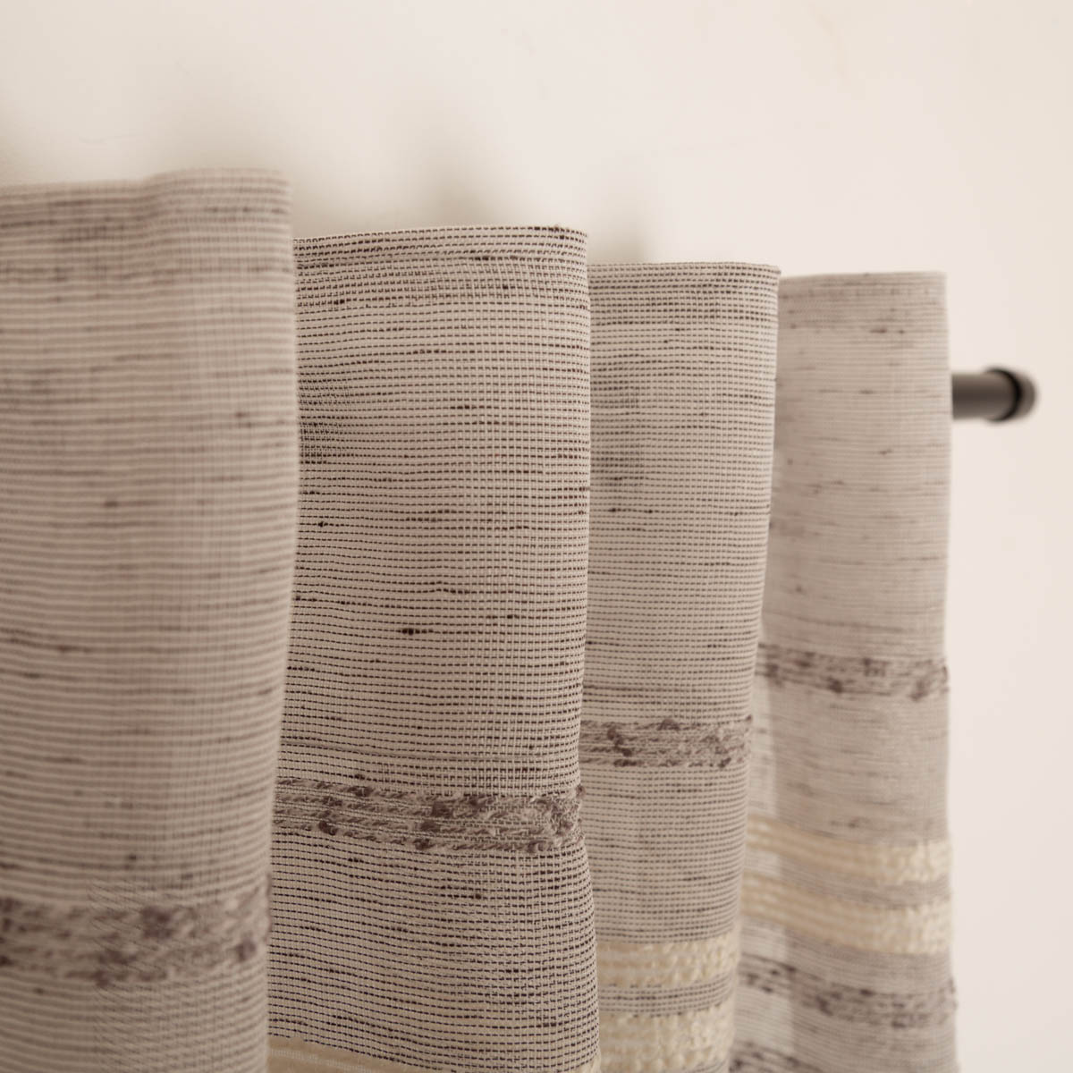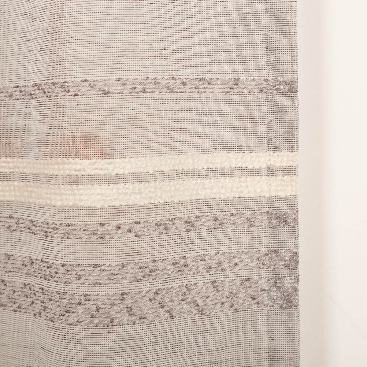 Diese Gardine aus transparentem Voile bringt ein ruhiges, modernes Ambiente in dein Zuhause. Die eingewebten grauen und wollweißen Bouclé-Streifen verleihen dem Stoff eine feine, rustikale Struktur, die perfekt zu modernen, skandinavischen und natürlichen Wohnstilen passt. Der grau melierte Voile sorgt für einen sanften Lichteinfall und bietet gleichzeitig einen leichten Sicht- und Blendschutz – ideal für Wohn-, Ess- oder Schlafzimmer.