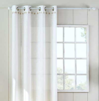 Halbtransparenter Ösenvorhang in Natur mit feiner Blumenborte und natürlicher Leinenstruktur für eine helle und wohnliche Fensterdekoration