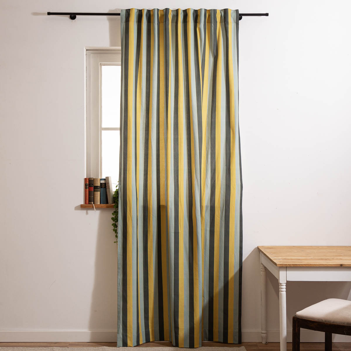 Dazu passt der Vorhang mit Streifen in Grün, Grau und Blau