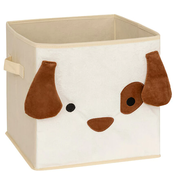 Diese schöne Aufbewahrungsbox bringt sofort gute Laune ins Kinderzimmer. Die Vorderseite zeigt ein liebevoll gestaltetes Hundegesicht aus weichem, samtigem Stoff, während die Seiten glatt und schlicht in hellem Beige gehalten sind. Perfekt, wenn du spielerisches Design mit einer ordentlichen, modernen Optik kombinieren möchtest.