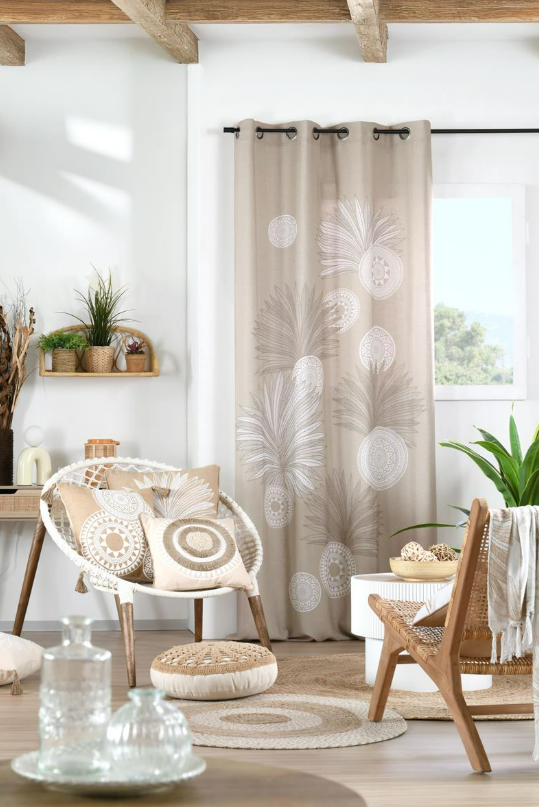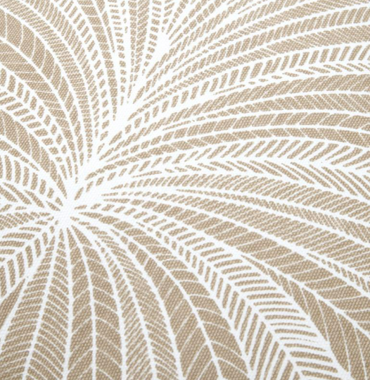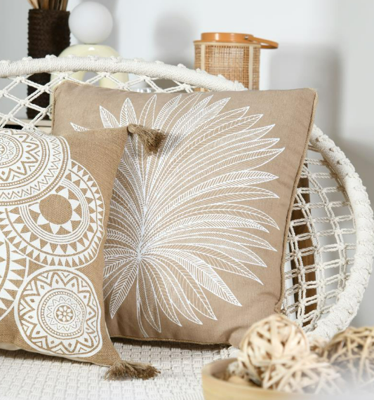 Dieses dekorative Kissen mit Palmenblätter-Dessin bringt natürliche Eleganz und einen Hauch Boho-Flair in dein Zuhause. Das exklusive französische Design kombiniert eine helle, freundliche Farbgebung in Natur und Weiß mit einer markanten Jute-Kederumrandung, die dem Kissen eine hochwertige, handwerkliche Optik verleiht. Ideal für Sofa, Sessel, Bett oder Lieblingsplatz im Wohnbereich.