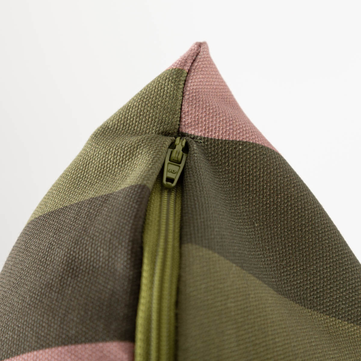 Dazu passt die Kissenhülle mit Streifen in Rosa, Braun und Grün