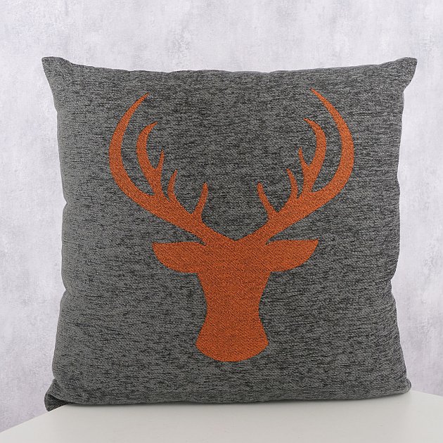 Die Vorderseite begeistert mit einem eingewebten Hirschkopf-Motiv auf weichem Chenillegewebe. Das sorgt für eine angenehme, wohnliche Optik und verleiht dem Kissen eine besondere Struktur. Die Farbkombination aus Grau und Orange wirkt warm, harmonisch und dekorativ, ohne zu unruhig zu sein.