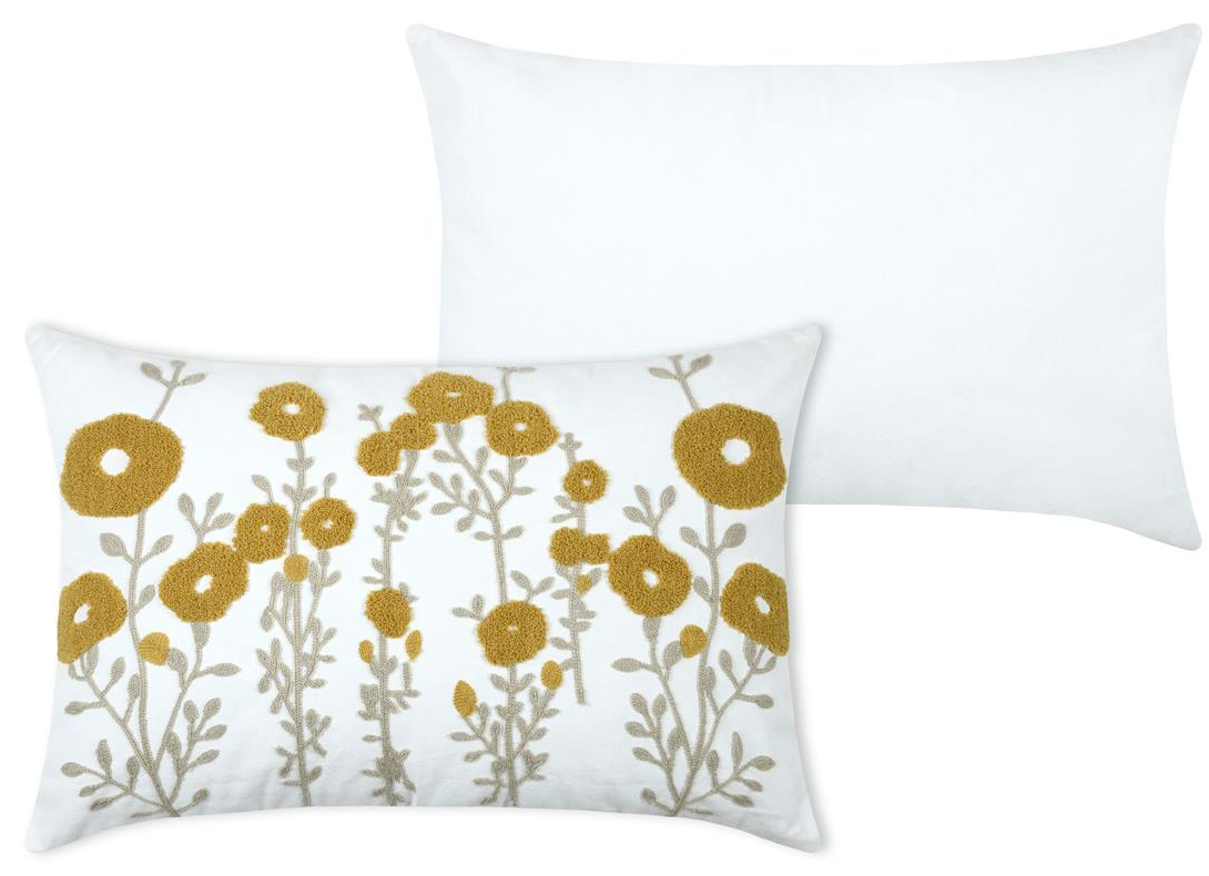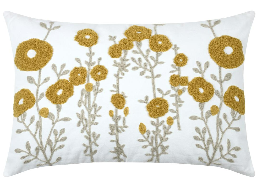 Du suchst ein Kissen, das freundlich, natürlich und dekorativ wirkt? Dieses rechteckige Kissen in 40 x 60 cm verbindet eine ruhige Grundfarbe in Wollweiß mit getufteten Blüten in Gelb und fein gestickten Blättern und Stielen in Beige. So entsteht ein florales Design, das Wärme ausstrahlt und gleichzeitig angenehm zurückhaltend bleibt.