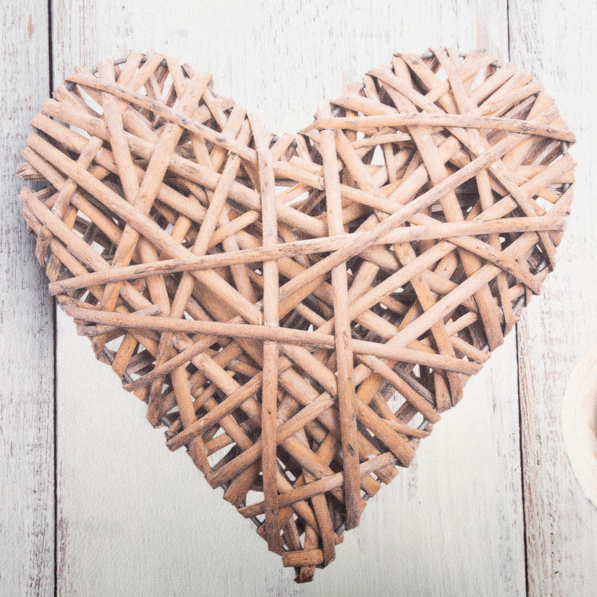 Design: Herzmotive in Holzoptik auf beigem Holzplanken-Hintergrund