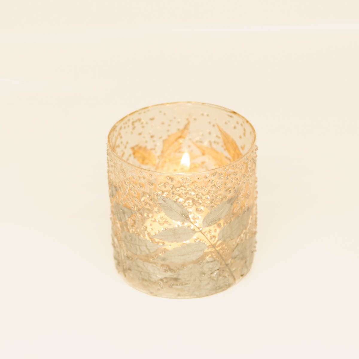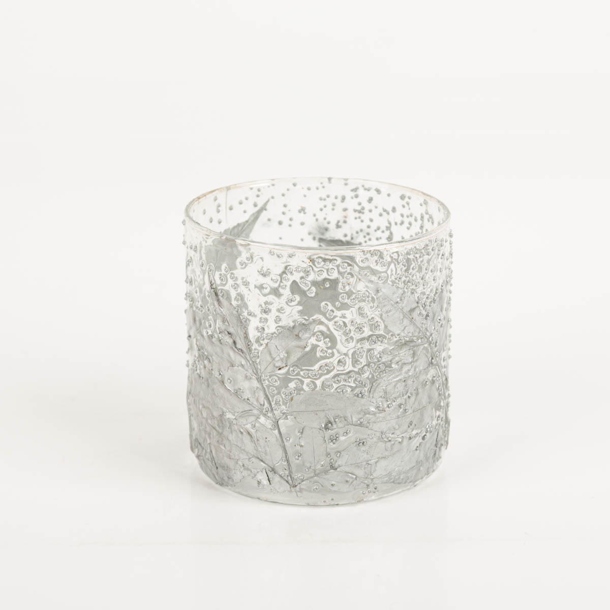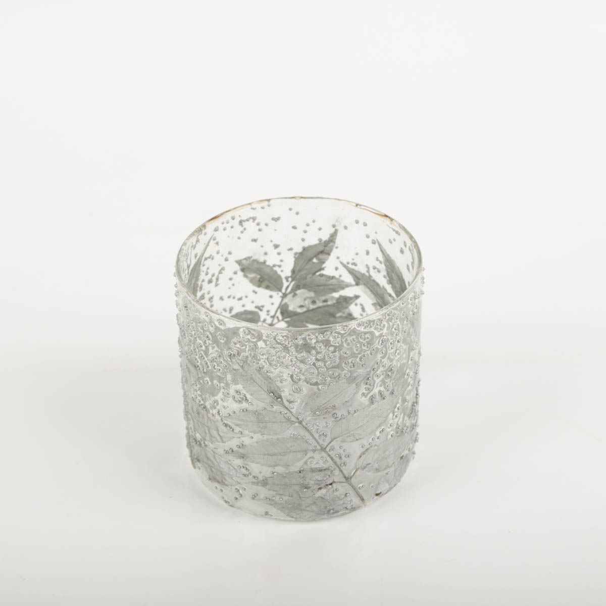 EDLES BLÄTTERDESIGN: Windlicht „Leaves“ aus transparentem Glas mit silbernen Blättern – dekorativer Teelichthalter für stimmungsvolles Licht